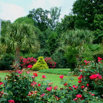 Dwarf palmetto palms, Windmill palms, Knockout roses and another one our specialties Perennial Hibiscus 'Red Star'