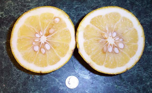 On a cold December day in 2003, I visited him at his home south of Mt, Olive, NC z8a. He has two of the trees which had many grapefruit-size fruit on them and I estimated the trees to be 12-15 feet tall. Dr Bullard informed me that he was given the trees 20 some years ago by someone named Dunstan and that they were a cross between a grapefruit and trifoliate orange. This is thought by some to be what was at one time called the "Dunstan Grapefruit".